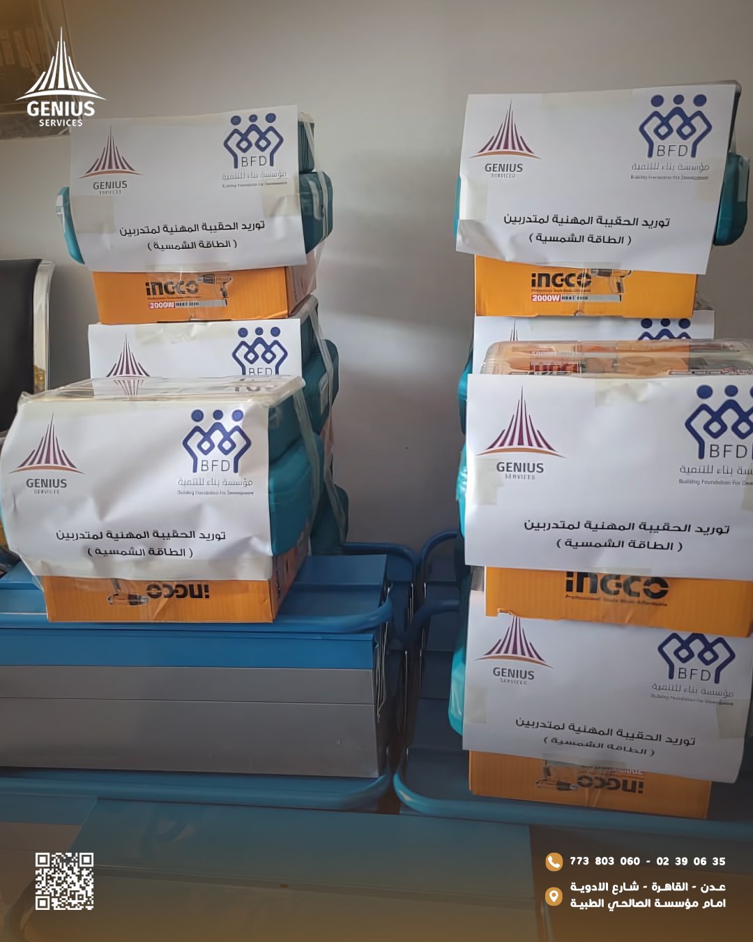 في إطار دعم التمكين الاقتصادي وبناء القدرات، نفّذ مكتب جينيس للخدمات العامة مشروع توريد حقائب تمكين مهني لصالح مؤسسة بناء للتنمية، وذلك ضمن برامج التدريب والتأهيل المهني.